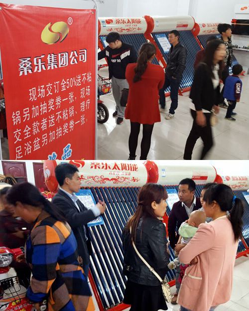 活動當天,公司人員親臨現(xiàn)場進行指導,對桑樂太陽能熱水器,凈水機產(chǎn)品知識進行視頻播放和細致講解。當主持人宣布產(chǎn)品優(yōu)惠活動開始后,所有用戶都交現(xiàn)金購買自己所需的產(chǎn)品,活動現(xiàn)場達到了銷售高潮。