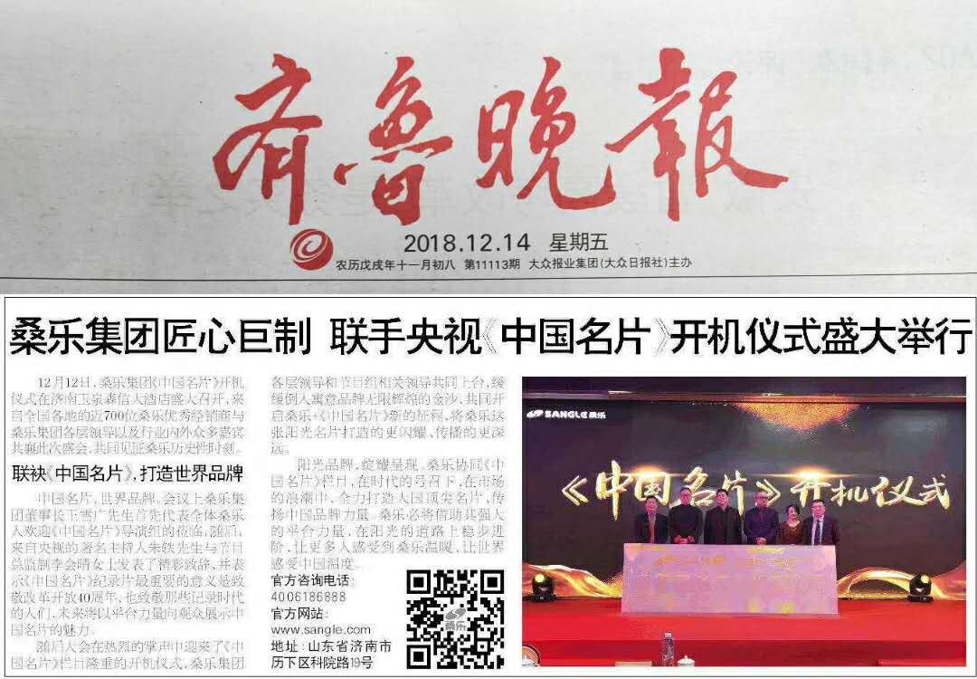 桑樂集團(tuán)匠心巨制,聯(lián)手央視盛大舉行《中國名片》開機(jī)儀式。在時(shí)代的號(hào)召下、在市場(chǎng)的浪潮中,全力打造大國頂尖名片、傳揚(yáng)中國品牌力量。桑樂必將借助其強(qiáng)大的平臺(tái)力量,在陽光的道路上穩(wěn)步進(jìn)階,讓更多人感受到桑樂溫暖,讓世界感受中國溫度。今日《齊魯晚報(bào)》就這一盛況做了專訪,具體內(nèi)容如下: